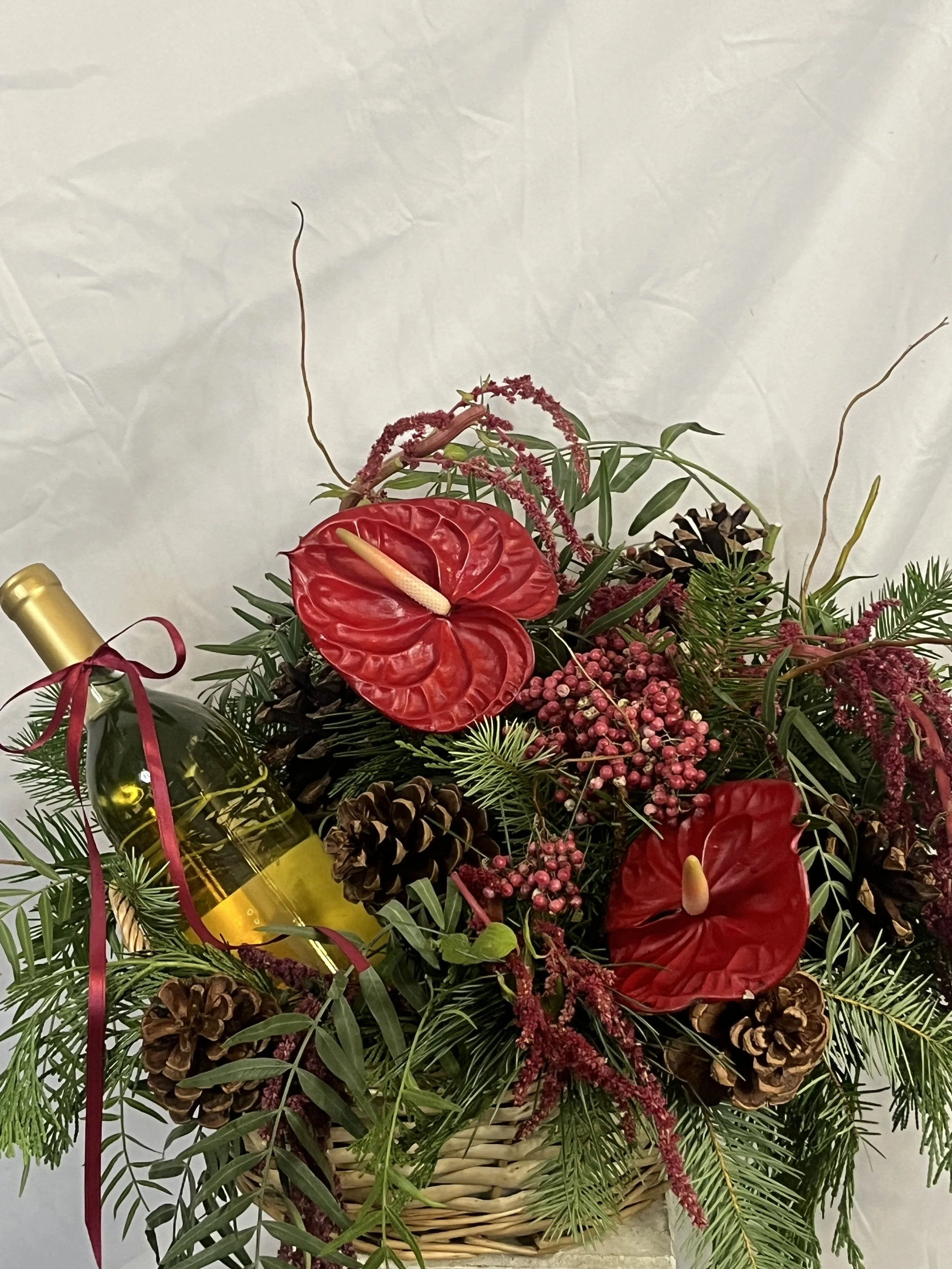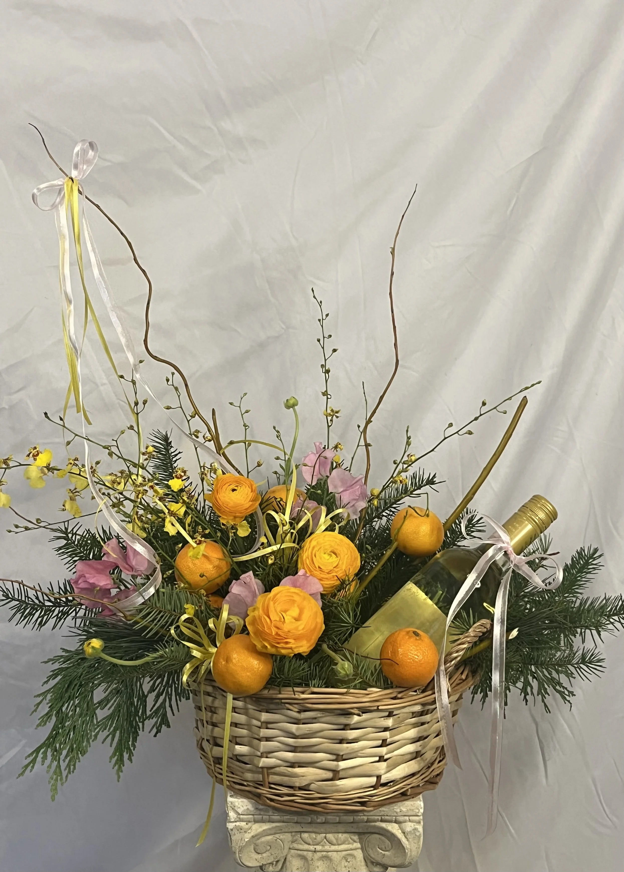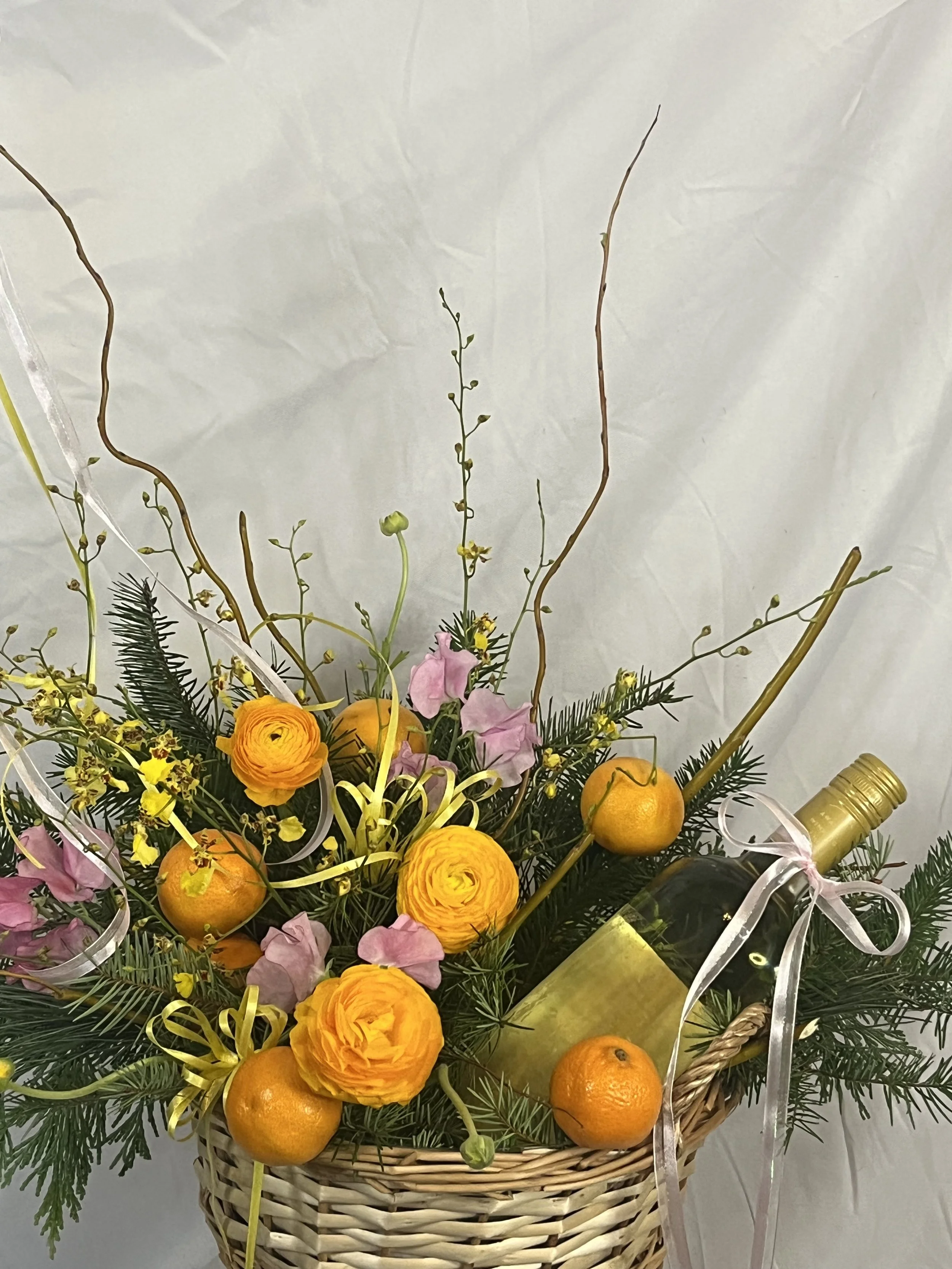 *Please note: Any wine or beverage bottles shown in photos are not included with the basket arrangements. Each design intentionally leaves half of the basket open for you to add your own bottle. Whether it’s wine, champagne, sparkling juice, or any celebratory drink of your choice.
