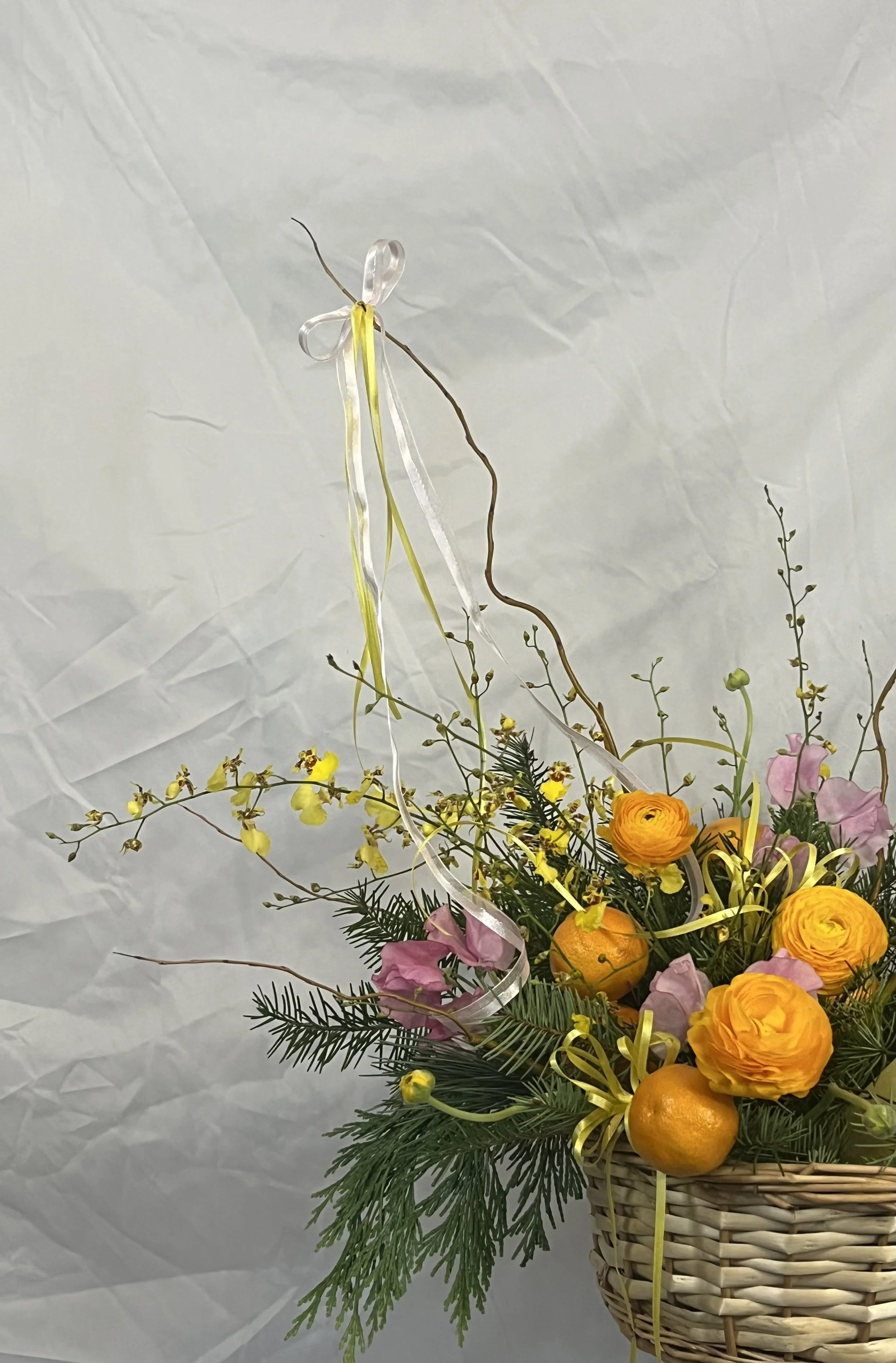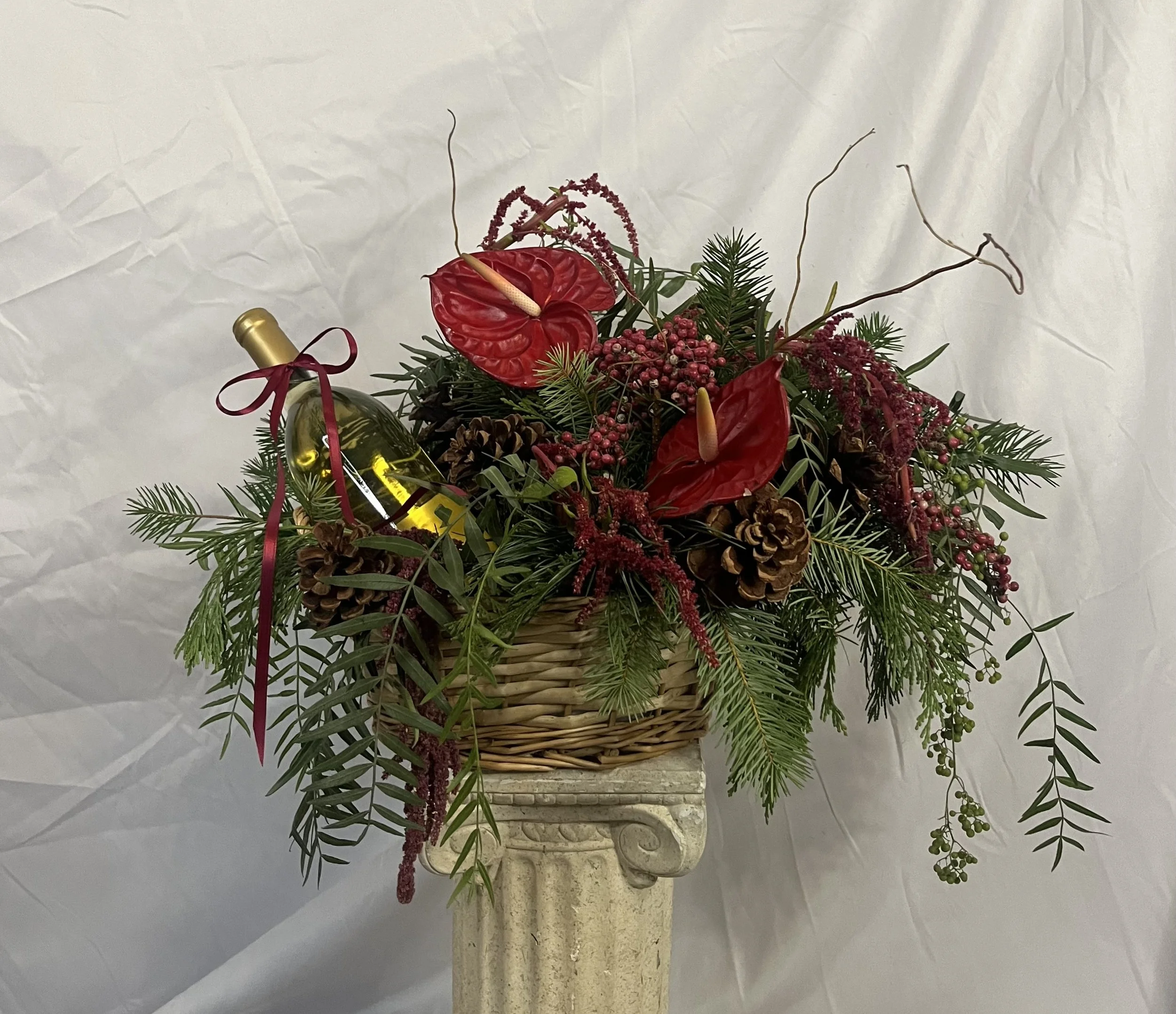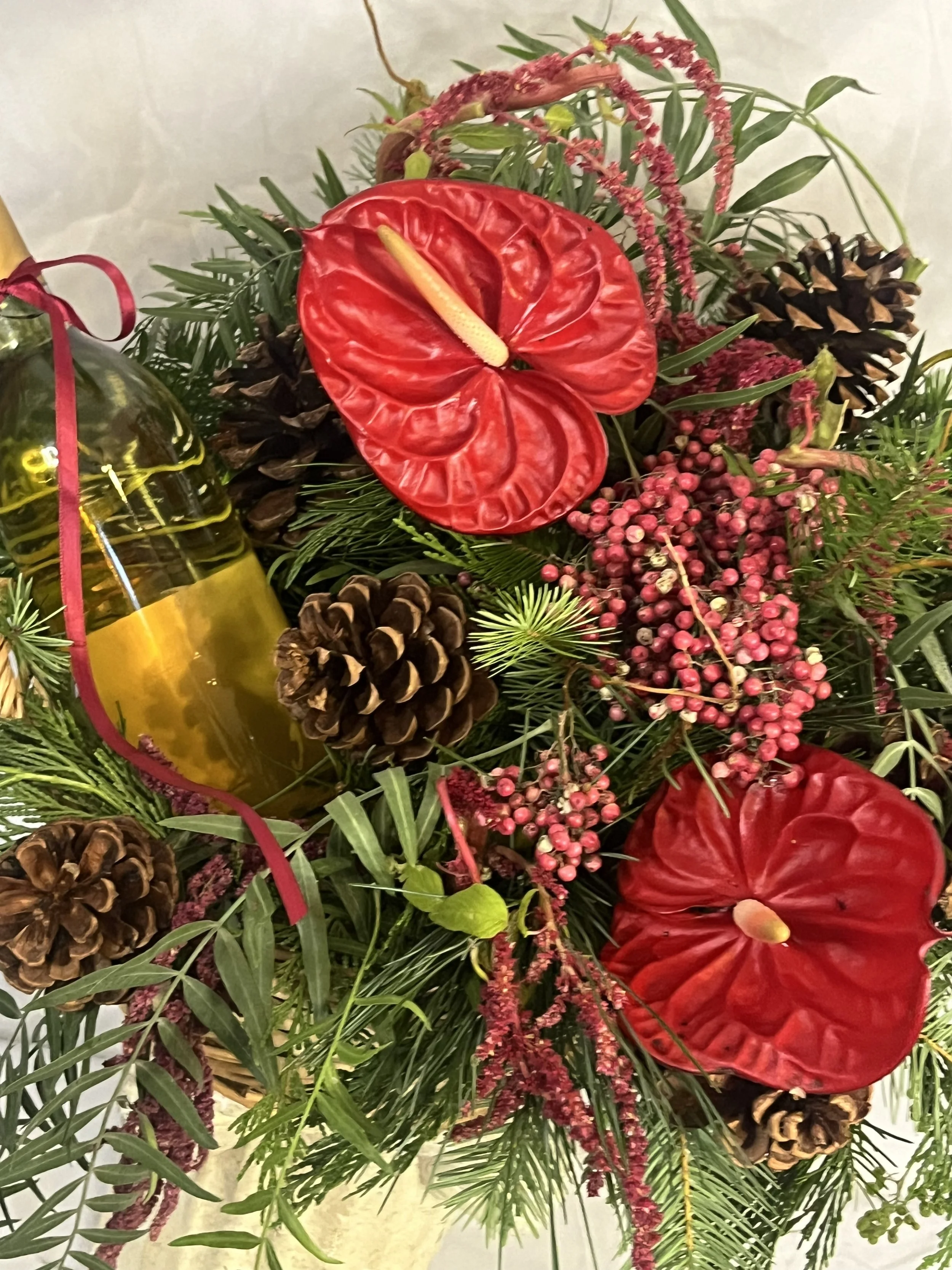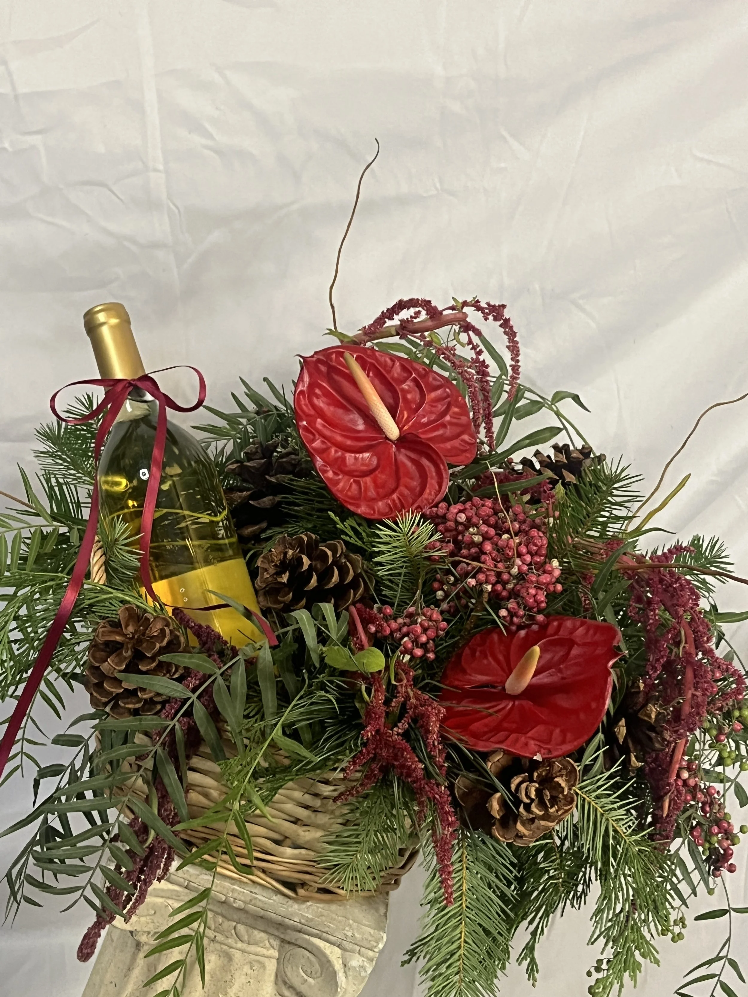 *Please note: Any wine or beverage bottles shown in photos are not included with the basket arrangements. Each design intentionally leaves half of the basket open for you to add your own bottle. Whether it’s wine, champagne, sparkling juice, or any celebratory drink of your choice.
